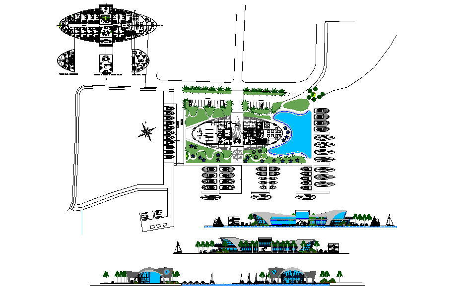 This Club House Project DWG showcases a complete layout plan featuring a sport center, gym, spa, salon, restaurant, landscaped zones, water bodies, outdoor seating areas, and a detailed circulation network. The main central building includes clearly defined activity rooms, fitness zones, wellness suites, indoor courts, dining areas, and lounge spaces arranged around a functional core. The site plan also displays walkways, garden areas, tree plantations, and a waterfront zone with docks and boat access, providing a full recreational experience within the clubhouse environment. Parking bays, entry routes, and access points are marked with accurate alignment for smooth visitor movement.