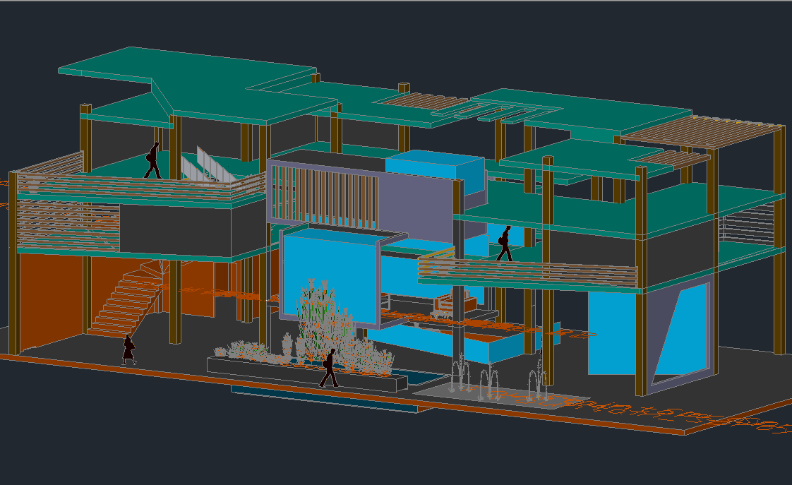 Housing and trade 3 D plan detail dwg file, with front elevation view detail, landscaping detail in tree and plant detail, stair detail, balcony detail in reeling detail, etc.