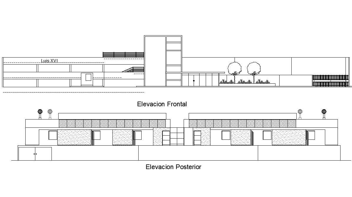 Elevation plan detail dwg file, with front elevation detail, side elevation detail, landscaping detail in tree and plant detail, etc.