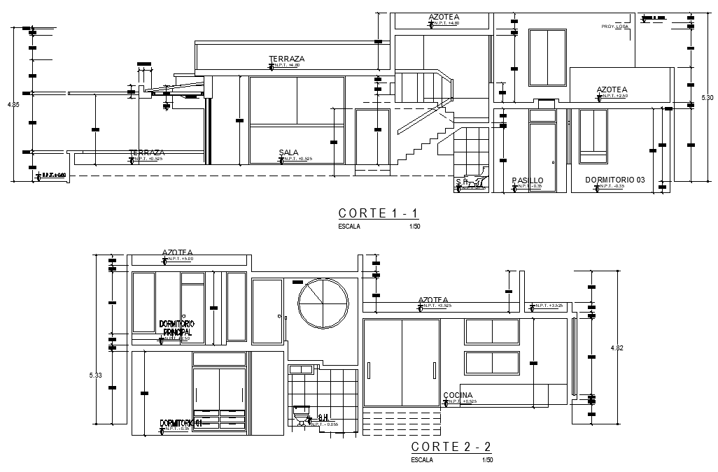 Section Beach house plan detail dwg file, including dimension detail, naing detail, section 1-1 detail, section 2-2 detail, etc.