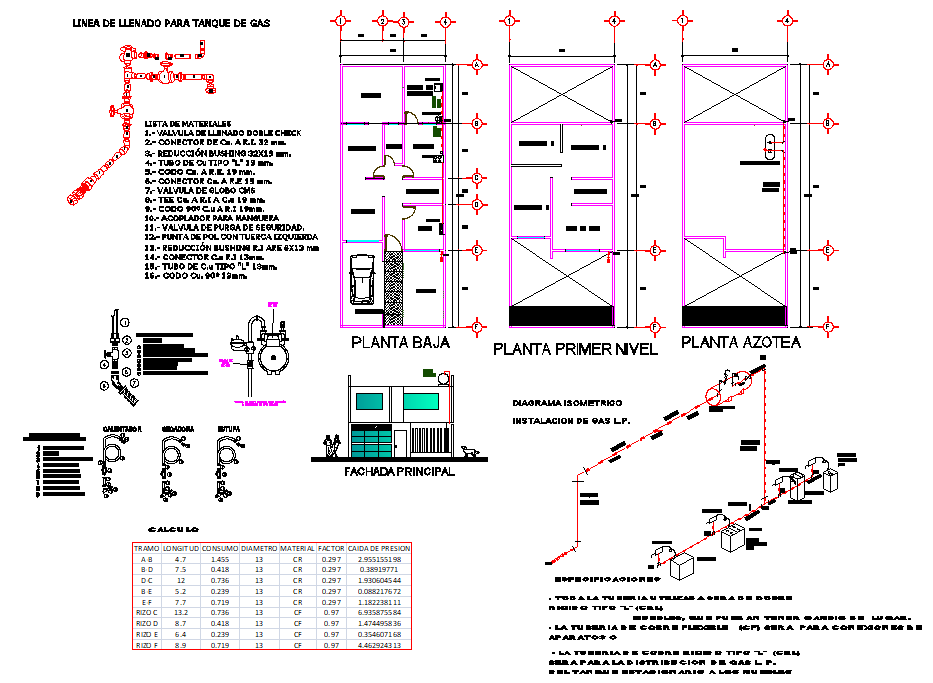 Gas installation housing plan detail dwg file, with centre lien plan detail, electrical circuit detail, front elevation detail, specification detail, etc.