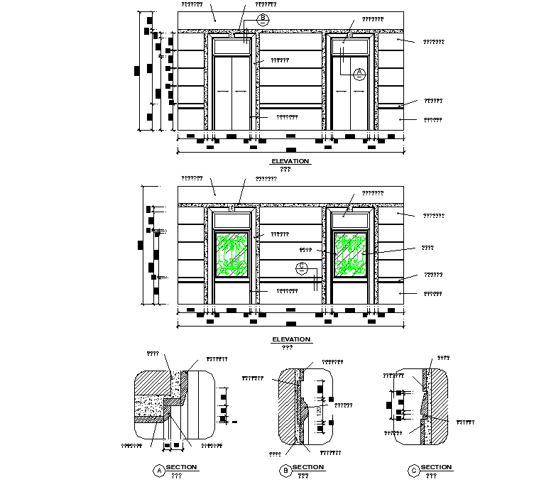 Door elevator detail dwg file, including dimension detail, naming detail, section line detail, etc.