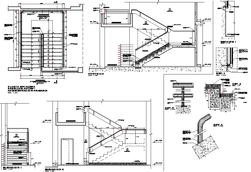 Detail in stair dwg file, with plan and elevation detail, riser and tread detail, pipe detail, dimension detail, naming detail, etc.