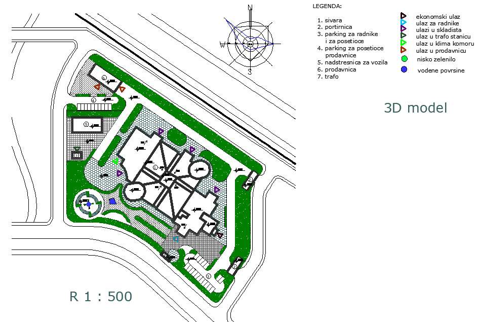 Site landscaping plan detail dwg file, with scale 1:500 detail, north direction detail, levelling detail, landscaping detail in tree and plant detail, etc.