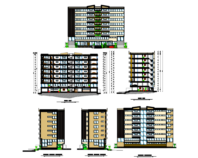 Office building dwg file. Elevation and side elevation, along with furniture detailing in AutoCAD format.