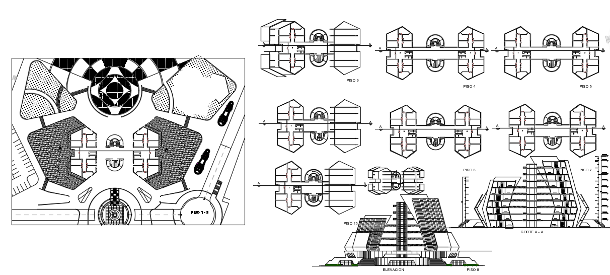 Civic center dwg file. Architecture Layout that includes various floors and layout plan including dimension detail, naming detail, foundation section detail, front view detail, side view detail, etc.