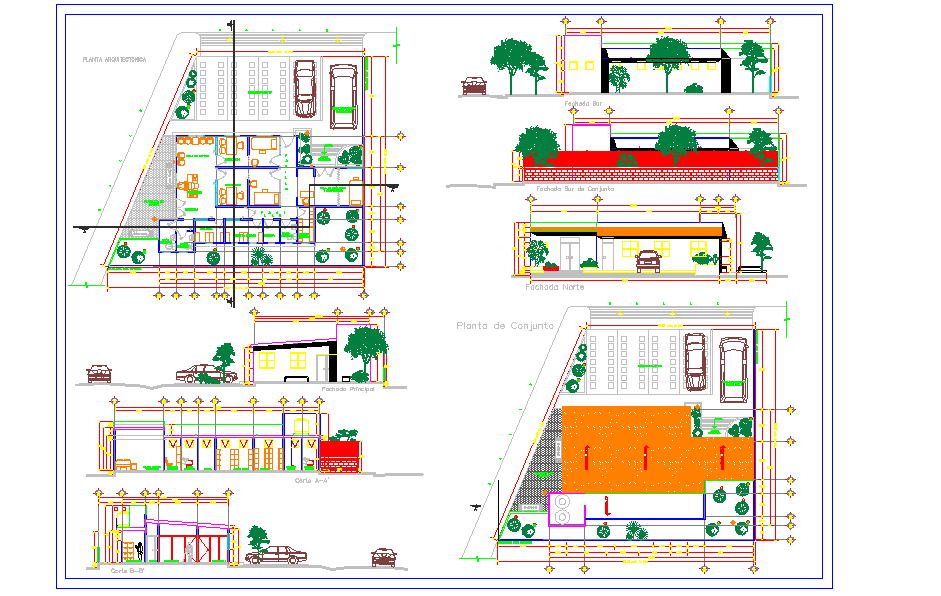 The set further highlights sectional drawings (Corte A-A and Corte B-B) showing slab levels, column positioning, staircase arrangement, and vertical alignment of office spaces. The file also contains a site layout with vehicle parking, pedestrian entry, landscape pockets, and overall boundary configuration. This DWG is ideal for architects, civil engineers, contractors, interior designers, AutoCAD learners, and anyone requiring a detailed reference for modern office design. Every element in the drawing is structured with clean layering, color coding, annotation styles, and measurement labels, reflecting a practical and construction-ready office project.