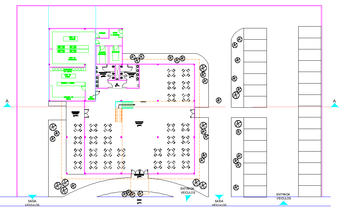 Restaurant plan detail dwg file, with landscaping detail in tree and plant detail, section line detail, furniture detail in table, chair, door and window detail, etc.
