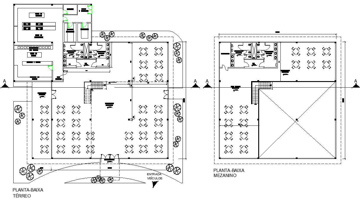 Ground floor and terrace plan Restaurant plan detail dwg file, including cut out detail, section line detail, landscaping detail in tree and plant detail, etc.