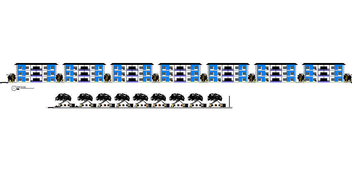Elevation residential plan detail dwg file, including front elevation view detail, landscaping detail in tree detail, furniture detail in door and window detail, etc.