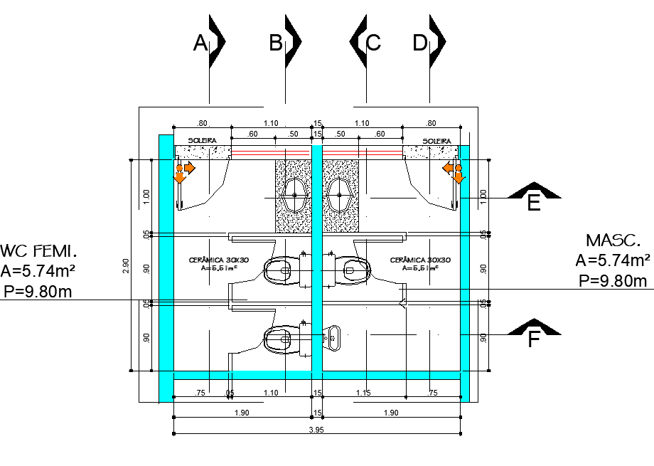Toilet planning detail dwg file, with section line detail, dimension detail, naming detail, sink detail, water closed detail, etc.