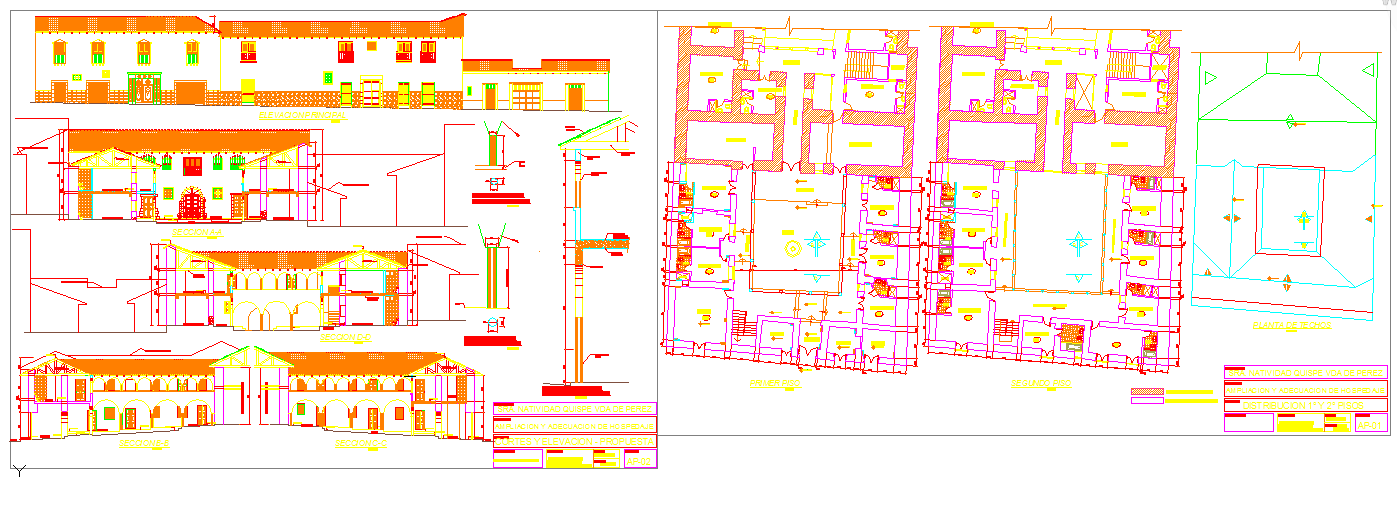 The DWG also presents detailed secciones A-A, B-B, C-C y D-D, roof structures made with rollizos de eucalipto, and existing building connections essential for renovation or conservation projects. The principal elevation shows façade elements such as windows, wooden doors, colonial roof tiles, decorative enchapado, and proportional spacing for architectural reference. This file is ideal for architects, civil engineers, interior designers, builders, and CAD users who need a precise Hotel Colonial elevation and section AutoCAD DWG for restoration, planning, modeling, or presentation work.