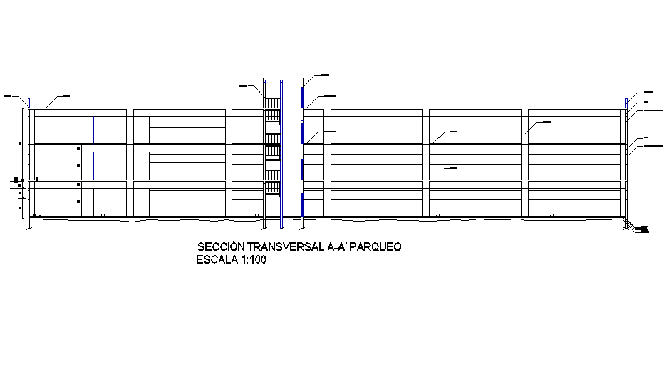 Section Building with park 4 levels plan detail dwg file, with dimension detail, naming detail, scale 1:100 detail, etc.