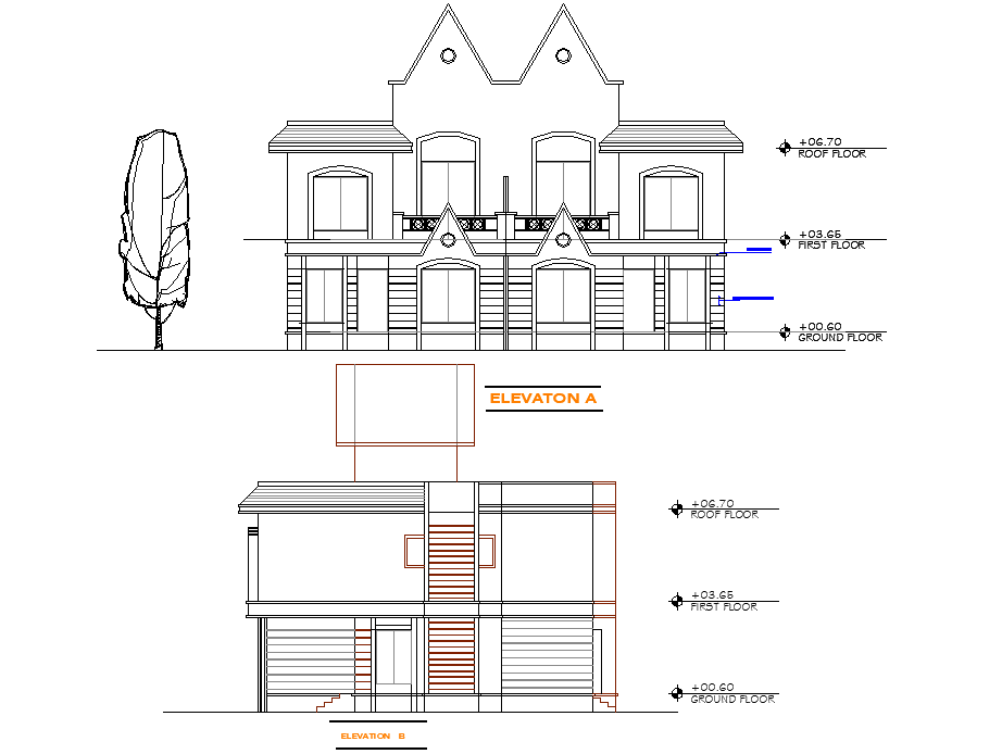 Twin bungalow elevation detail dwg file, with front elevation detail, side elevation detail, leveling detail, landscaping detail in tree detail, etc.