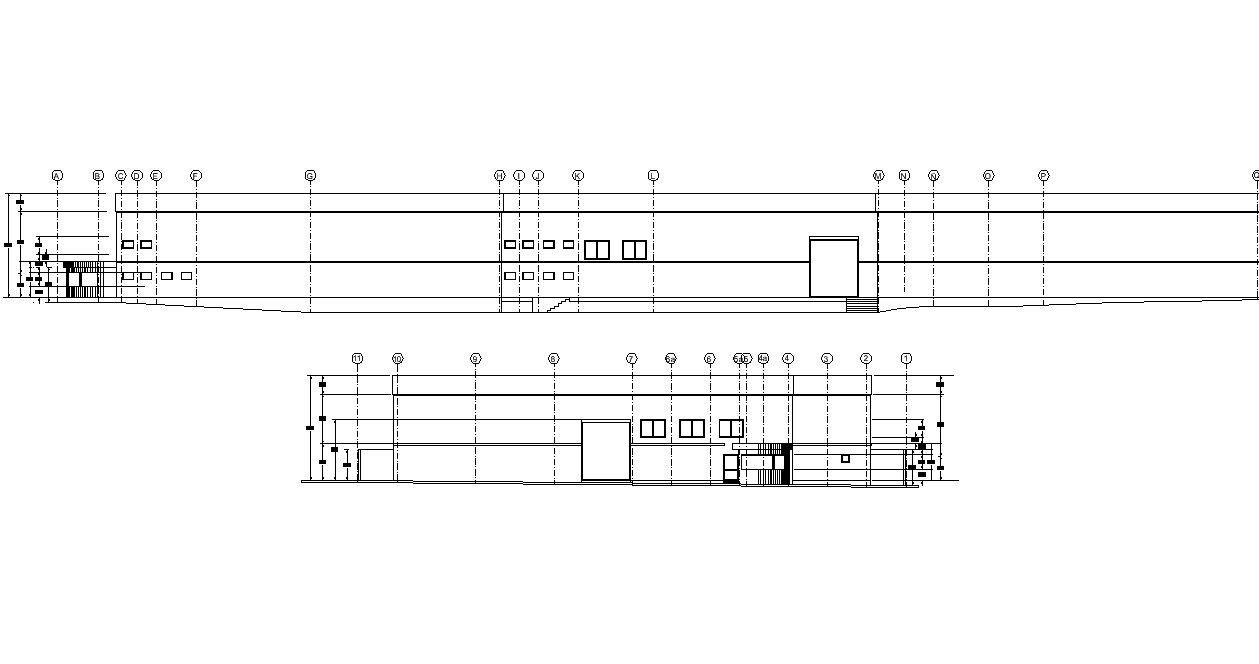 Elevation and section Ware house plan detail dwg file, with centre line plan detail, dimension detail, stair detail, etc.