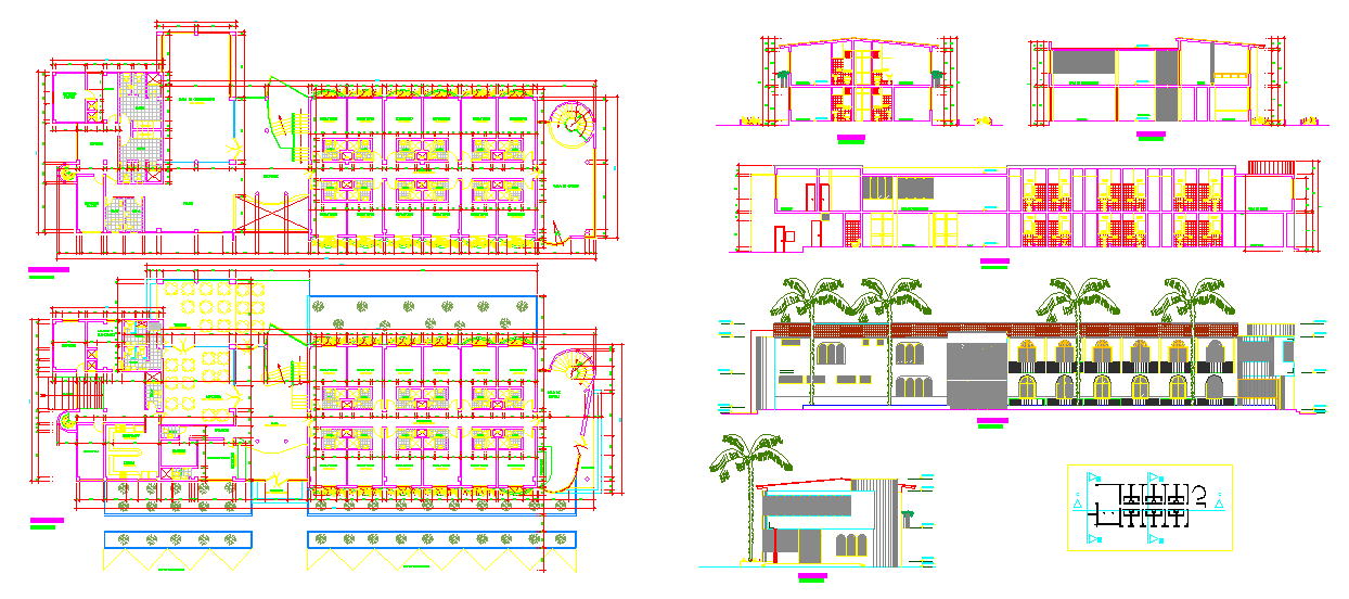 Along with the plans, the drawing contains multiple elevations and sectional views, displaying façade treatments, arched windows, column arrangements, decorative exterior elements and shading devices. Sections provide deeper construction clarity, highlighting slab levels, wall thicknesses, room heights and internal spatial layering. The façade drawings show the hotel’s modern design language with palm trees, boundary features and entrance detailing. Each element is carefully drafted to support architectural planning, interior layout visualization and project documentation needs. This DWG is suitable for architects, designers and engineers working on hotel design, interior planning and building presentation.