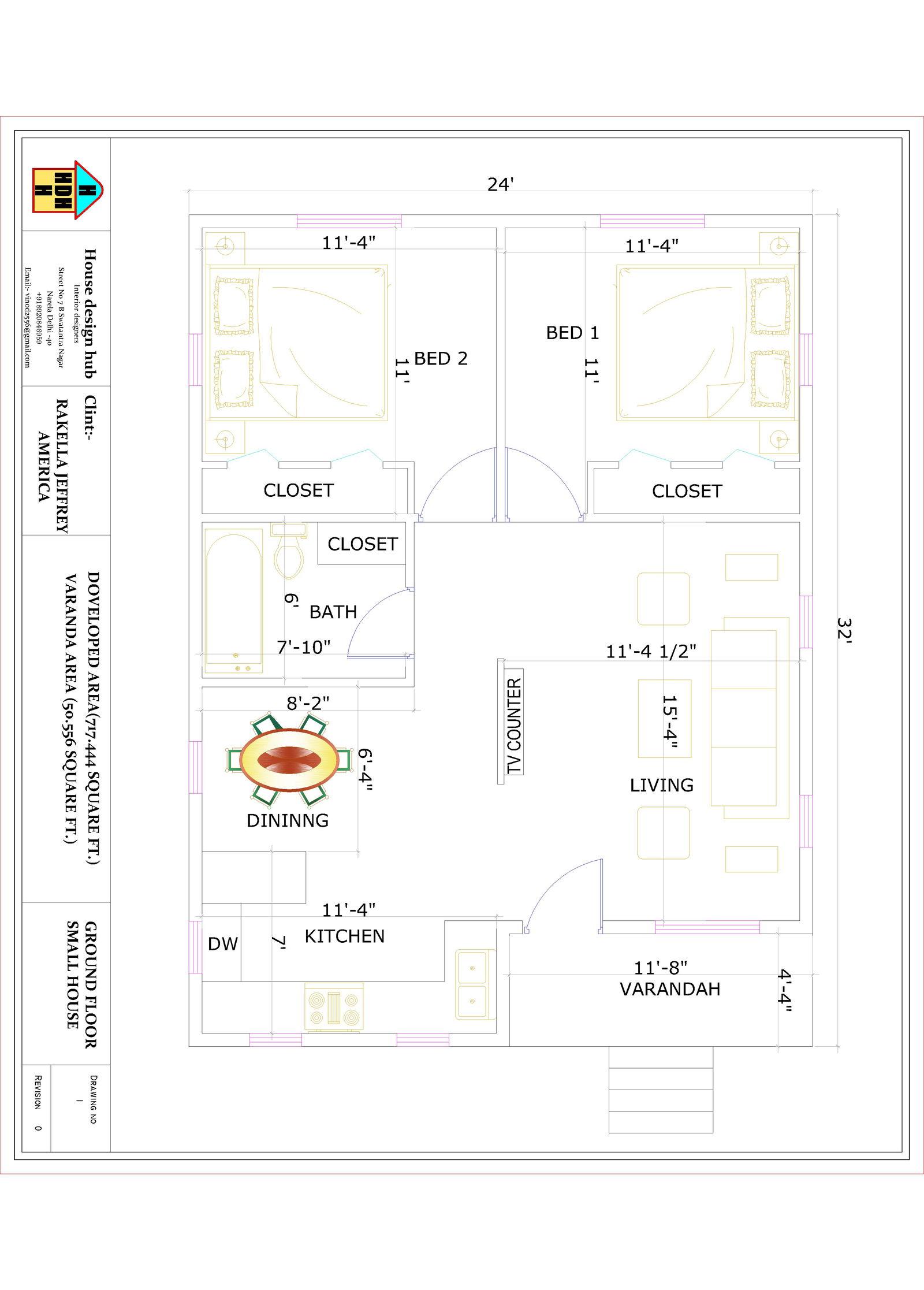 24'x32' house design 2 bed room 1 kitchen i living room 1 bathroom DOVELOPED AREA (717.444 SQUARE FT.) VARANDA AREA (50.556 SQUARE FT.)