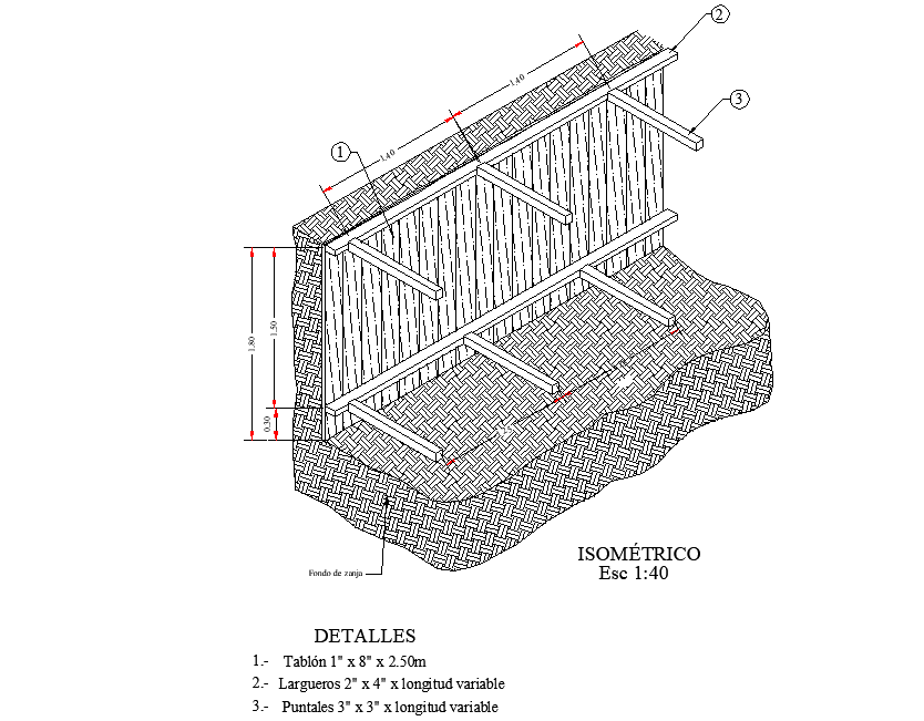 Isometric wood timbering plan detail dwg file, including dimension detail, naming detail, scale 1:40 detail, etc.