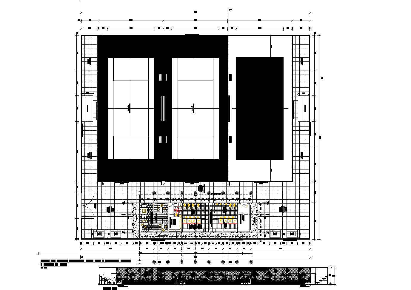 Center tennis, tennis-court plan. Plan with detailing and the court has been planned with detailing with exact dimensions.