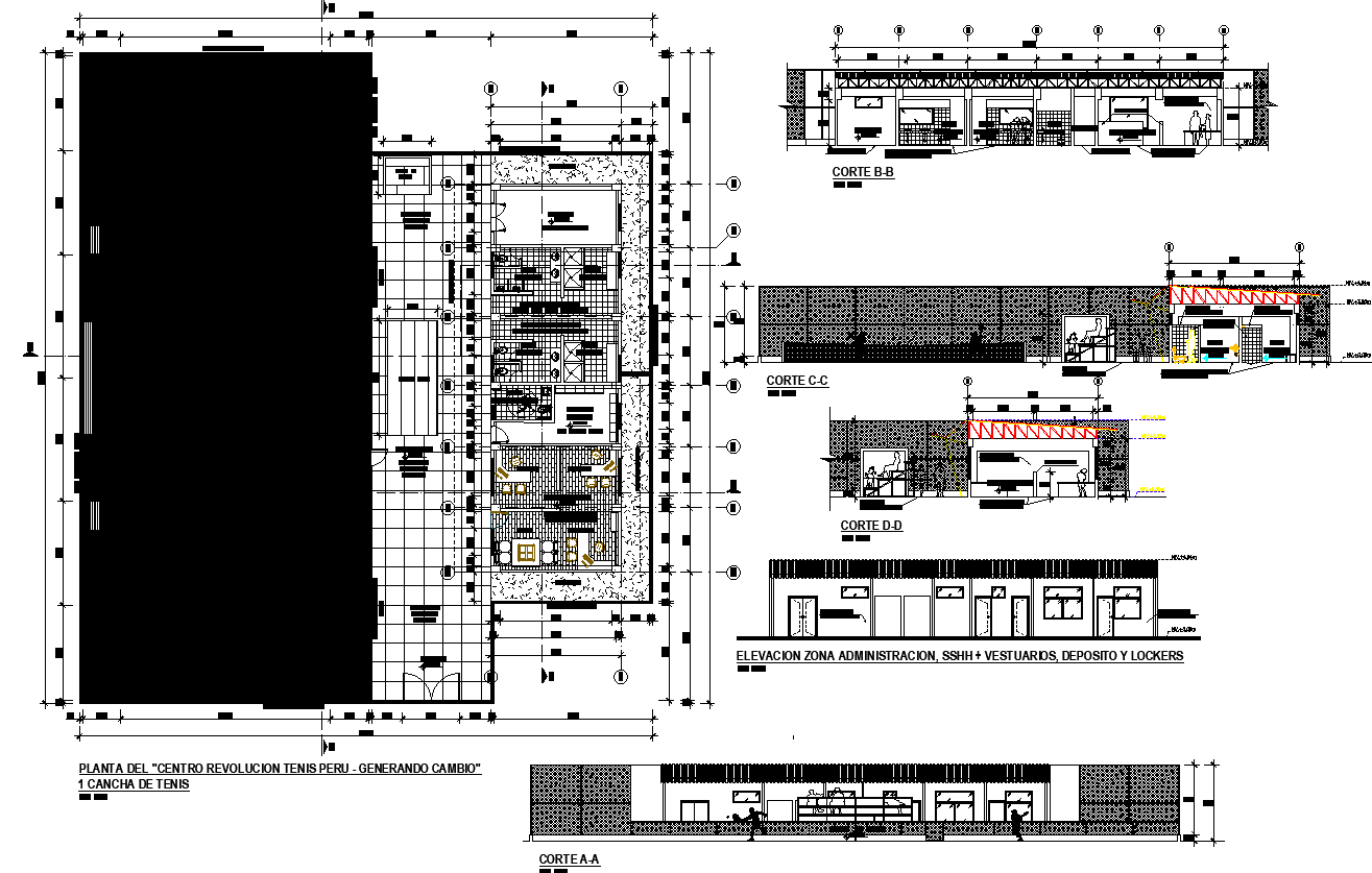 Tennis court plan. Plan with sections and dimensions. All the sections are shown here with different detailing.