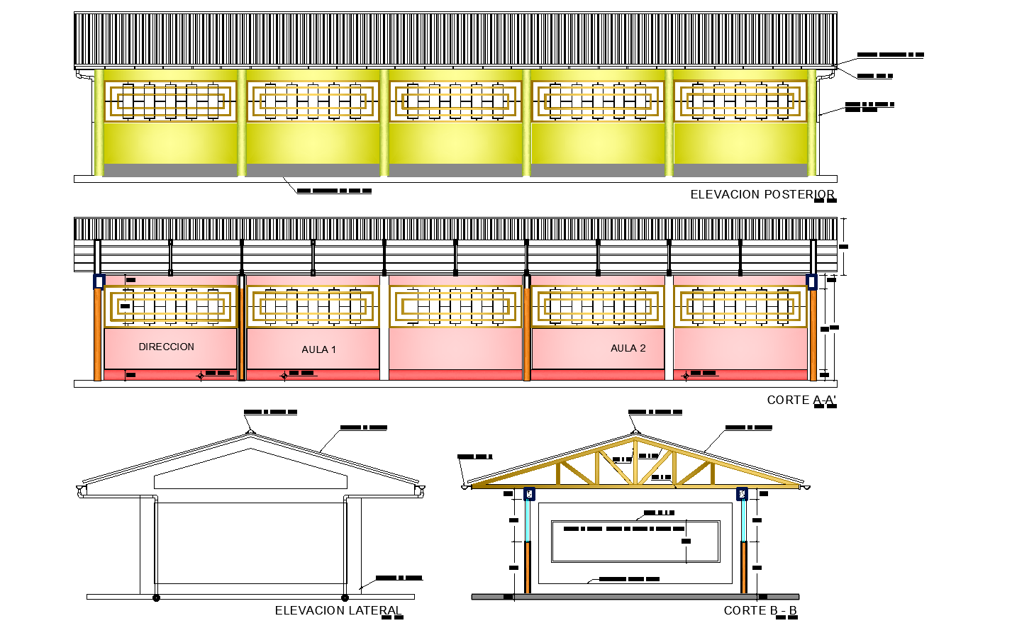 School plan with elevation. The front and side elevation Elevations are shown with the sum of detailing and textures.