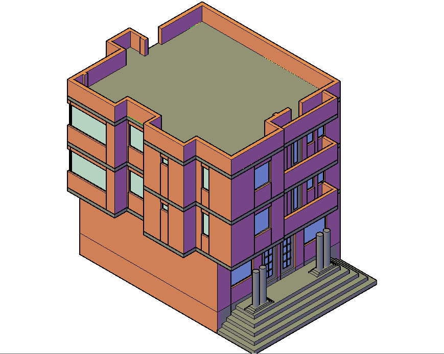House 3 D plan detail dwg file, with front elevation view detail, column plan detail, tarrece plan detail, furniture detail in door and window detail, etc.