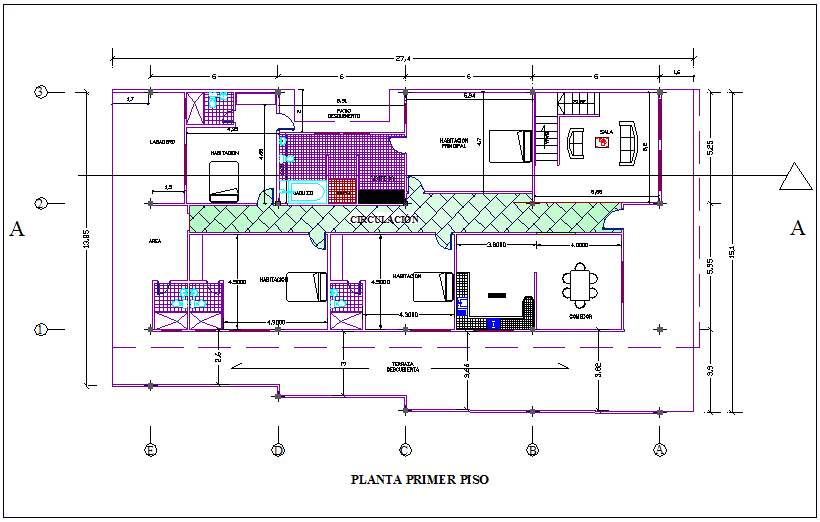 Commercial housing first floor plan dwg file in plan with view of area view with area view with wall,circulation area with bedroom,kitchen,washing area and dining area and view of housing area