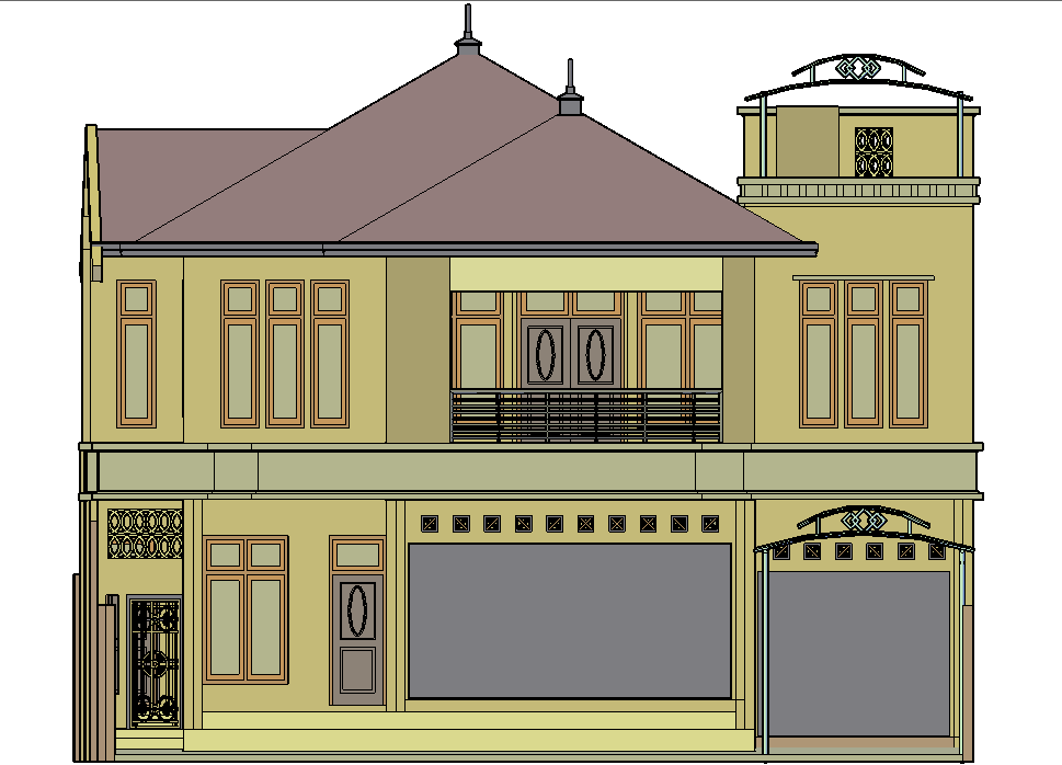 Rinjani 3 d plan detail dwg file, with front elevation detail, balcony reeling detail, furniture detail in door and window detail, etc.