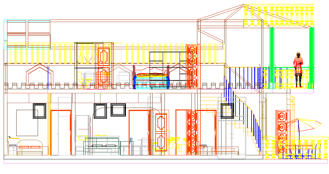 Hozanam house 3 d furnished plan detail dwg file, with stair detail, balcony detail in reeling detail, furniture detail in bed, chair, table, door and window detail, etc.