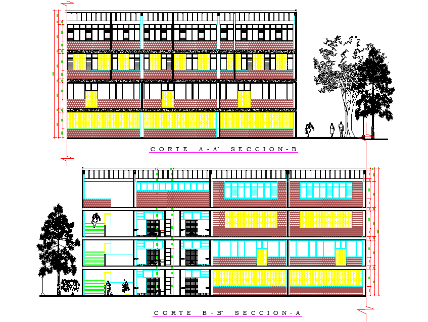 Section school plan detail dwg file, with section A-A’ detail, section B-B’ detail, dimension detail, landscaping detail in tree and plant detail, etc.