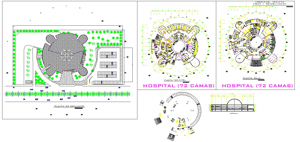 This Hospital Design Plan DWG presents a complete architectural solution featuring a circular building layout designed to accommodate 72 beds across multiple medical units. The drawing includes the general site plan, ground floor distribution, and first-level planning with a radial arrangement that enhances circulation and patient access. The main block is divided into treatment rooms, emergency zones, rehabilitation areas, consultation rooms, specialized medical units, and administrative spaces arranged around a central core. The exterior layout incorporates landscaped green belts, vehicle entry routes, and a structured parking zone placed beside the main hospital block for convenient access. The radial corridors are dimensioned to maintain smooth movement between wards and service rooms.