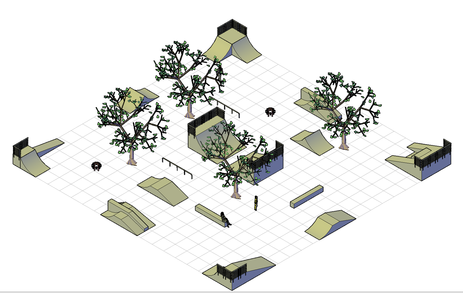 Skate-park design plan. Planning of park with different skate rides, with different dimensions, plantations, seatings around.