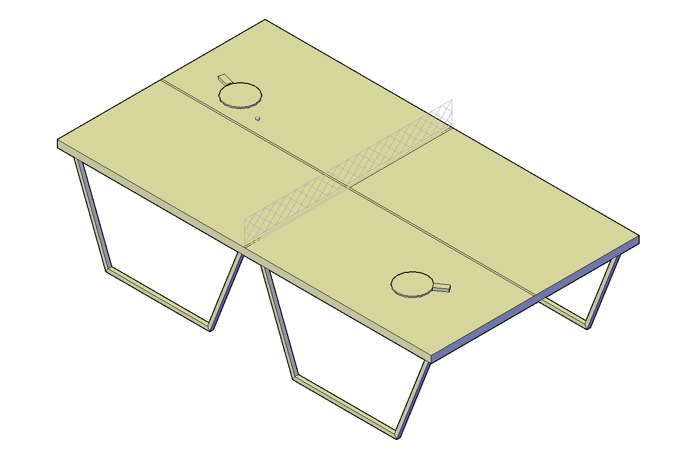 Table tennis table plan. A table where two persons play with racquets and a ball. The dimensions on each side are shown in 3D detail.