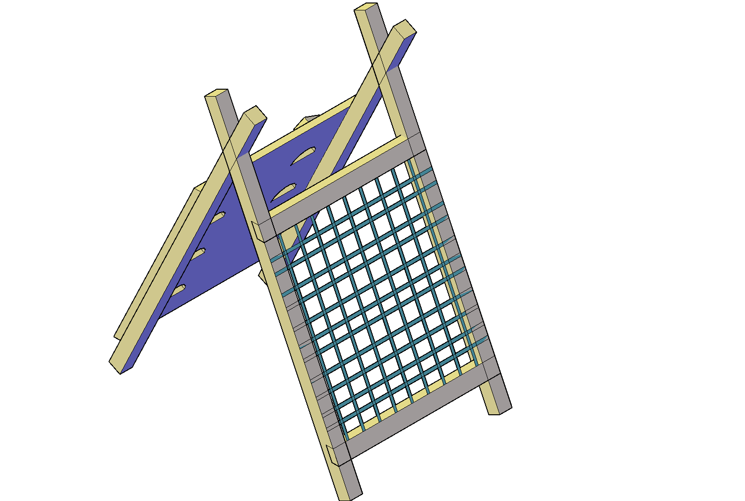 3D Playground design plan. The dimensions on each side are shown in 3D detail. The criss-cross wooden or steel railing with the net inside.