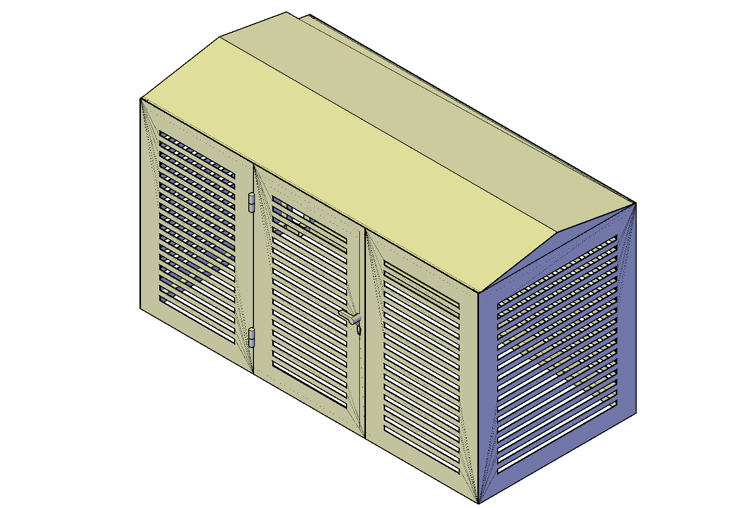 Generator building plan. A building with railing for ventilation space and covered from the top. It has been shown in 3D detail.