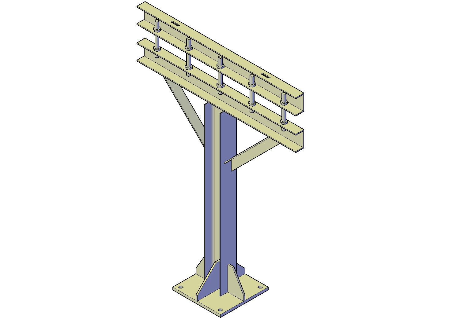 H beam plan in 3D. Steel detail in fixed or adjustable heights. Detailing of railing, screwing detail, foundation detail, etc.,