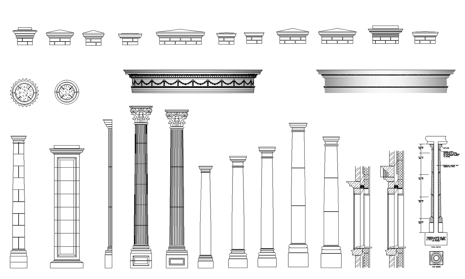 Detail of arch plan. Plan with detailing and sections. Each plan is shown with different dimensions according to the usage and space.