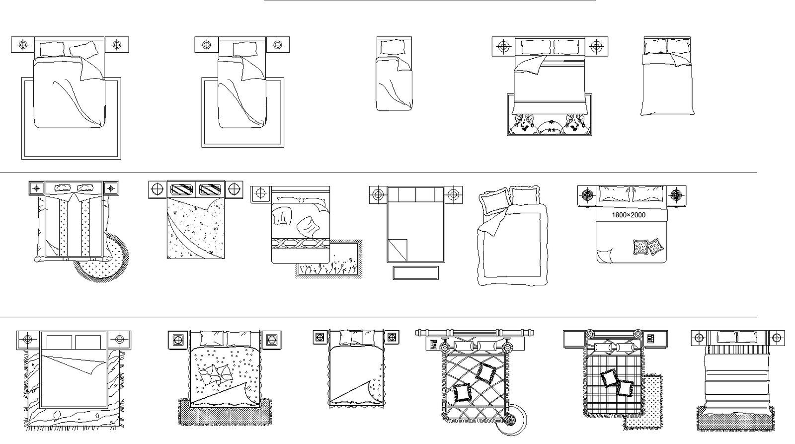 Beds plan. Beds with different dimensions and sizes according to one’s need. Single bed, double bed, master room bed, every style of beds with detailing.