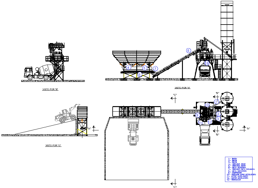 Plant concrete manufacturing hormign detail dwg file, with numbering naming detail, section line detail, truck detail, etc.