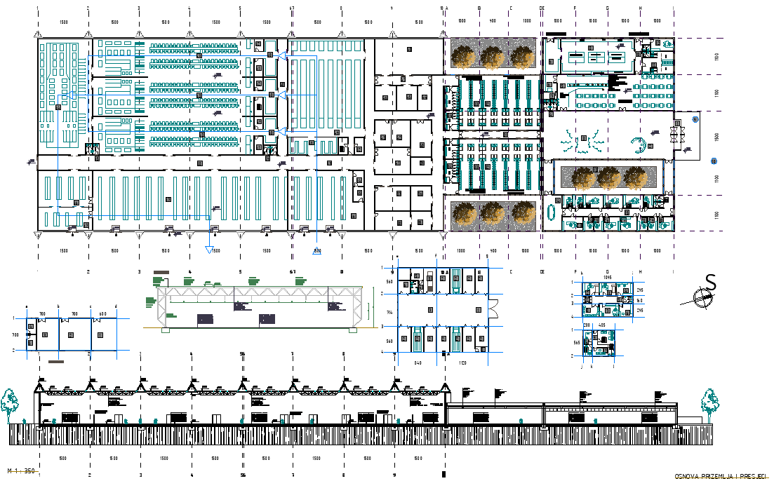 Elevation industrial buildings plan detail dwg file, with dimension detail, front elevation detail, south direction detail, etc.