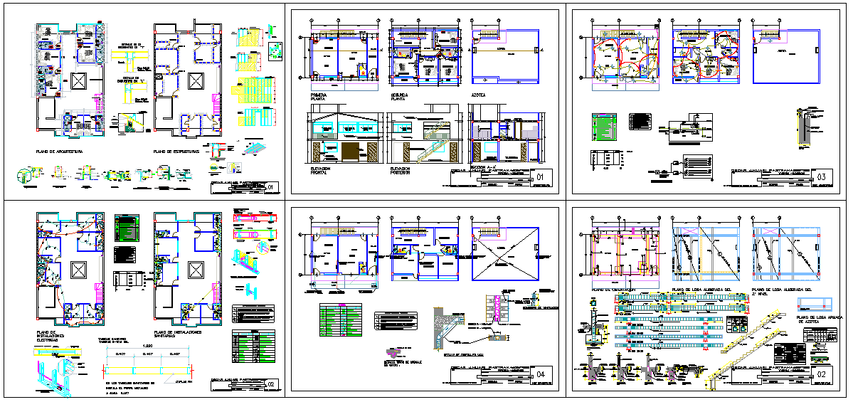 This Architectural Housing Plan DWG provides a detailed layout integrating architectural distribution, structural planning, electrical systems, and sanitary installation drawings. The architectural plan includes multiple rooms such as Cuarto 01, Cuarto 02, Cuarto 03, Cuarto 04, Cuarto 05, and Cuarto 06, all arranged around a central patio. Wall dimensions and partitions are illustrated with precise measurements, including 1.22m sanitary tabique divisions and internal corridor widths ranging between 1.00m and 1.20m. The structure plan highlights column placements, slab outlines, and beam intersections designed for efficient load transfer across the floor plate. Staircase positioning, laundry area location, and circulation routes are clearly marked, offering a complete overview of spatial functionality.