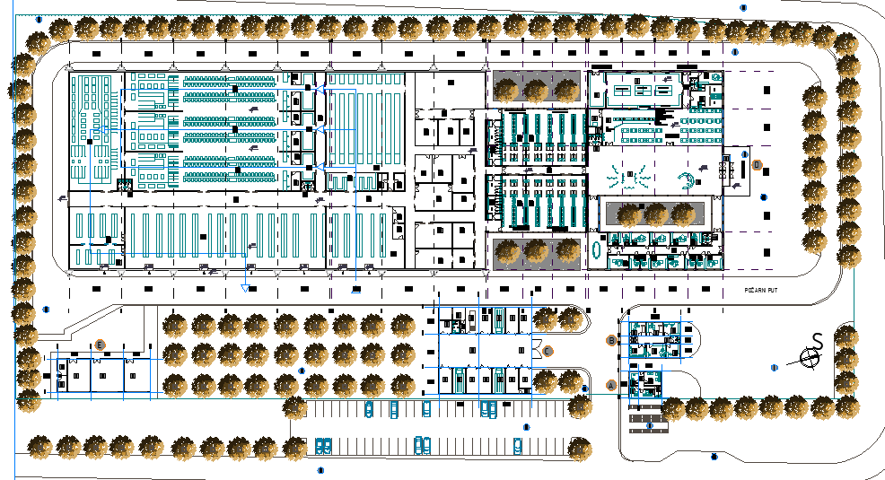 Industrial buildings plan detail dwg file, including landscaping detail in plant and tree detail, furniture detail in table, chair, door and window detail, etc.