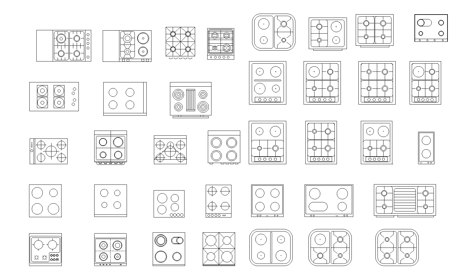 Stove plan. Stove in different styles, different patterns, different sizes, with different dimensions. The top view plan is shown in detail..