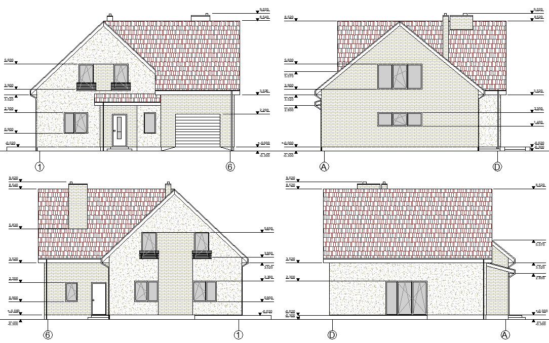 Elevation house detail dwg file, with centre line plan detail, leveling detail, front elevation detail, right elevation detail, left elevation detail, back elevation detail, etc.