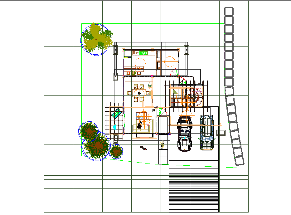 Country house plan detail dwg file, with car parking detail, landscaping detail in tree and plant detail, furniture detail in table, chair, window and door, etc.