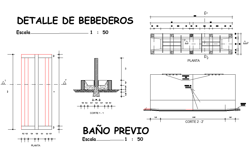 Detail of drinking fountains dwg file, including scale 1:50 detail, section line detail, dimension detail, naming detail, etc.