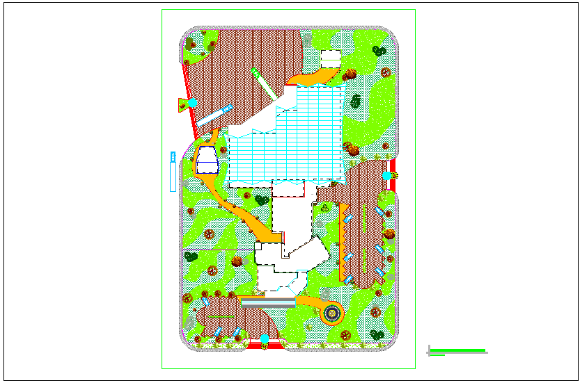 Implantation and cover plan for fruit preservation plant dwg file in plan with view of tree area view,parking area,seating area,hall,secretary office,admin area and washing area,manual machinery,cooling area, quality department with supervision area.