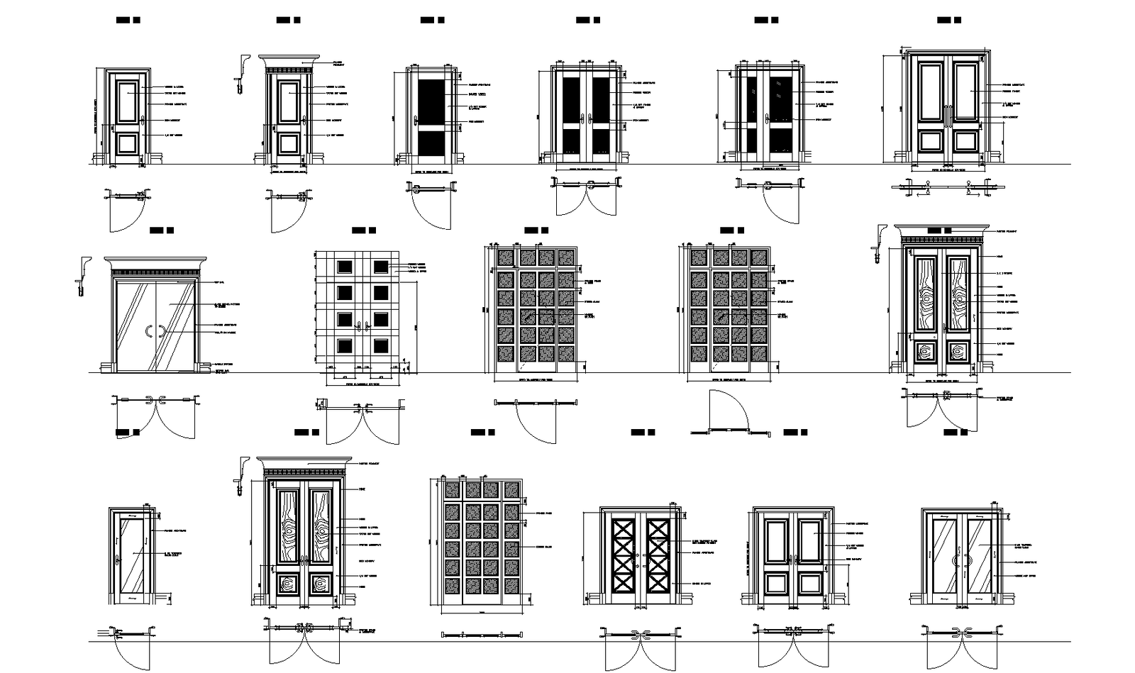 Door plan. Door with different styles and dimensions. Door with detailed frames. Detailing of handle and side frames is shown in detail.