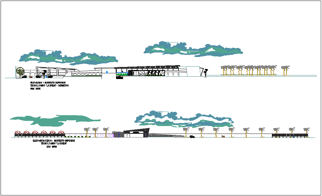 Elevation with different axis view for technical education building dwg file in elevation with view of floor,floor level,wall,door and window view and view of wall and wall support,tree view with necessary dimension.