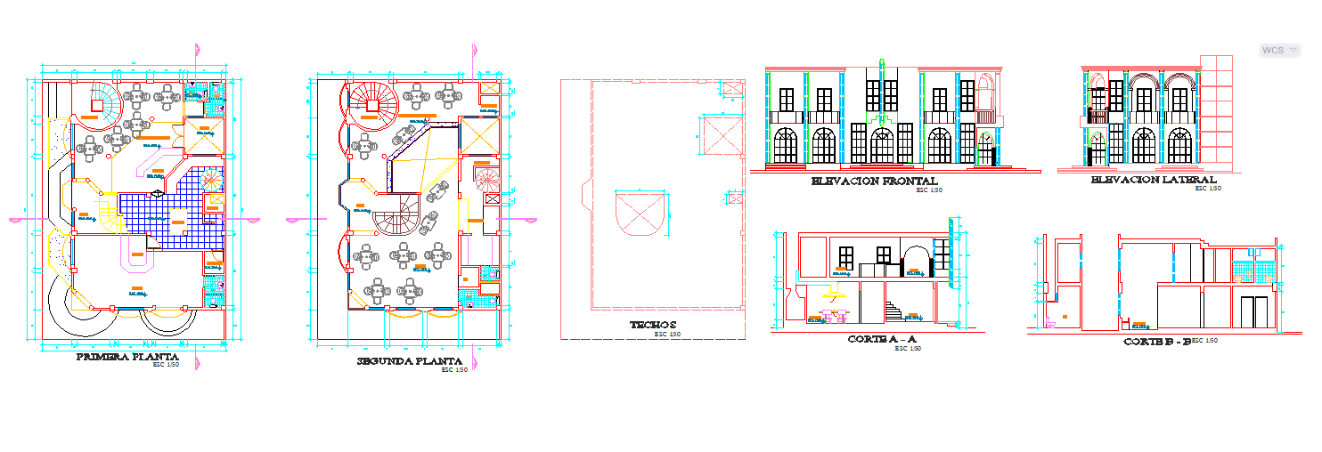 The design also includes a roof layout, showcasing top-level structural positioning and ventilation elements. The frontal and lateral elevations highlight the building façade with arched windows, decorative columns, and symmetrical window patterns that enhance the character of the restaurant. Sectional drawings provide clarity on stair geometry, interior levels, ceiling heights, and spatial connections across floors. This complete small restaurant design is suitable for architects, interior designers, engineers, and professionals looking for a compact yet aesthetically detailed café or dine-in restaurant concept with well-defined seating, service areas, and architectural expression.